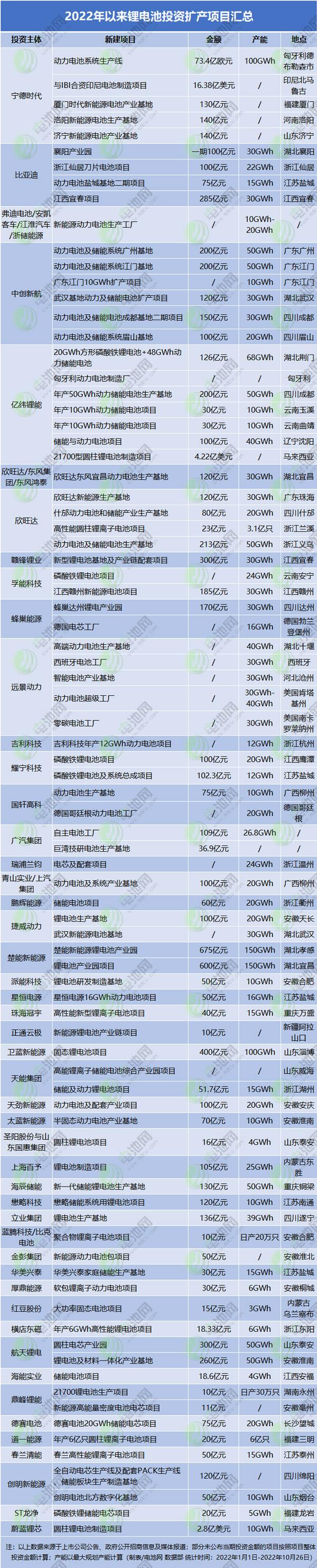 12月(yue)1日電池網公(gong)布的數據顯(xiǎn)示,據不完全(quan)統計,2022年以👉來(lái),僅在锂電💃池(chí)生産制造領(ling)域,新公布的(de)投資擴産項(xiàng)目🌈就多達84個(gè),其中有69個公(gōng)布投資金額(é),總金額超8427億(yì)元,平🔱均單個(gè)💚項目投資額(e)超122億元;公布(bù)年産能的項(xiàng)目有68個,總産(chǎn)能約2038GWh。
